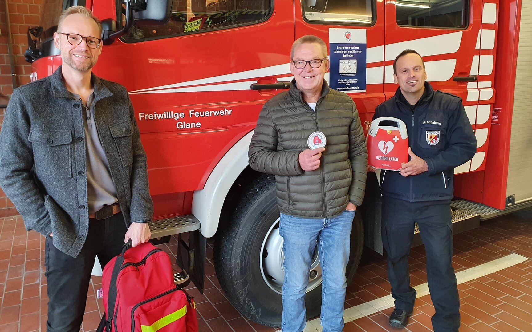 Bild oben: Retter in der Not: Der Bad Iburger Feuerwehrmann Frank Hengelbrock (links) wurde beim Zusammenbruch seines Bekannten Ralf E. (Mitte) durch die App der Mobilen Retter alarmiert und konnte ihm das Leben retten. Als Ansprechpartner beim Landkreis Osnabrück betreut Amin Schnieder (rechts) das Projekt der Mobilen Retter, das seit fünf Jahren den Rettungsdienst durch den schnellen Einsatz ehrenamtlicher Helfer vor Ort unterstützt.