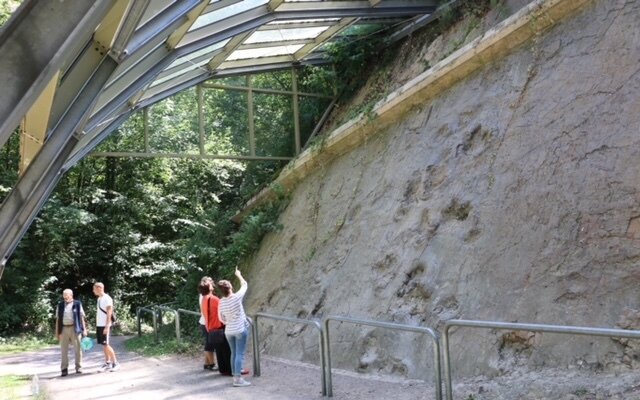 Allerdings wäre man nicht alleine gewesen. Eine Herde Langhalssaurier lief zu jener Zeit exakt an dieser Stelle vorbei. Am selben Tag hinterließen auch zwei große Raubsaurier ihre Spuren. Nachdem sich das Wiehengebirge auffaltete, erzählen uns die Saurierfährten heute im Steinbruch ihre Geschichte. 1921 wurden die Spuren entdeckt. Bis zu diesem Zeitpunkt hatte es noch keine Funde dieser Art gegeben.
