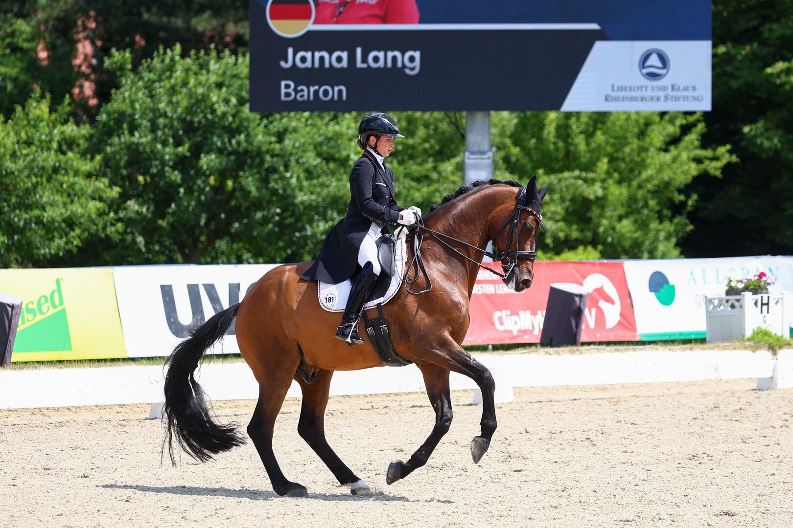 Bei den Jungen Reitern erklang ebenfalls die deutsche Nationalhymne in der Siegerehrung. Jana Lang (Schmidgaden) und Baron, Anna Middelberg (Glandorf) und Blickfang HC sowie Lucie-Anouk Baumgürtel (Nottuln) und ZINQ Ferati FH gelang es auch in dieser Altersklasse Dänemark auf den Silberrang zu verwiesen. Platz drei ging an die Reiter*innen aus den USA. Jana Lang und ihr 17-jähriger Sportpartner Baron sind seit drei Jahren ein Team, haben bereits gemeinsam Gold bei Europameisterschaften und der Deutschen Jugendmeisterschaft gewonnen. 75.196 Prozent erhielten die beiden heute für ihre Vorstellung, ein Ergebnis mit dem Lang sehr glücklich war: “Baron war richtig gut drauf. Ich bin sehr froh, dass wir ein gutes Einzelergebnis erzielt haben, aber am Ende will man auch das Ergebnis für das Team, deswegen bin ich umso glücklicher, dass es geklappt hat.”