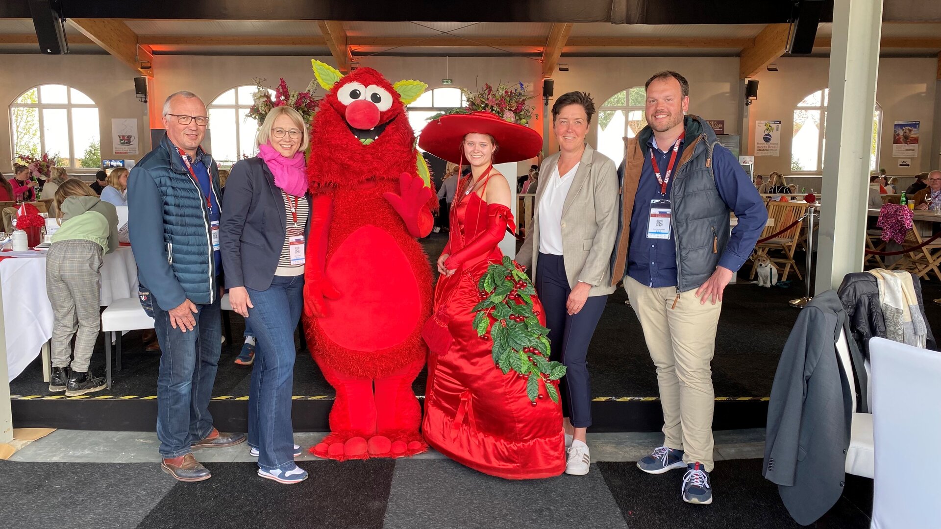 v.l. Michael Bensmann (stellvertretender Bürgermeister), Katharina Pötter (Oberbürgermeisterin Stadt Osnabrück), das Kirschmonster, Kirschkönigin Jessica, Christine Möller (Bürgermeisterin Hagen a.T.W.), Bastian Spreckelmeyer (Fraktionsvorsitzender CDU/FDP)