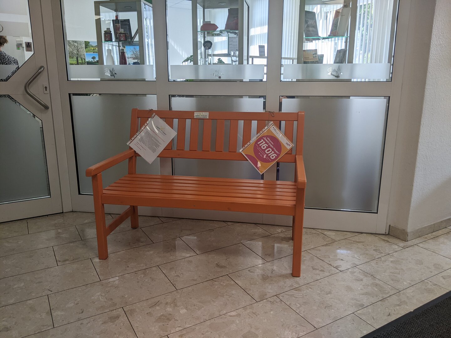 "Auch wir möchten in unserer Gemeinde ein Zeichen gegen Gewalt an Frauen setzen und unterstützen die Aktion, indem die orange Bank nun einige Zeit bei uns im Rathaus vor dem Bürgeramt stehen wird", so Christine Möller.