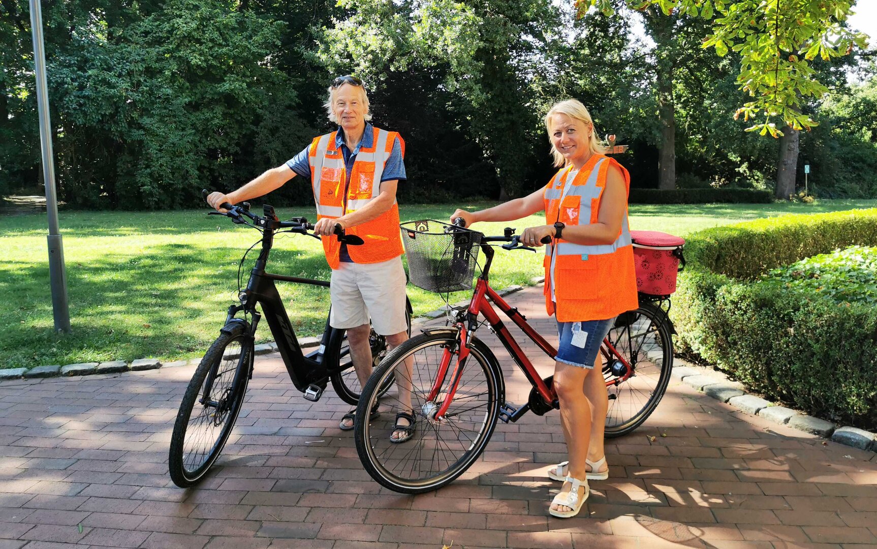 Mittlerweile haben Antje Röwekamp und Peter Simon schon einige Touren durchgeführt. Eine Tour bei den Hufeisen-Guides zu buchen ist ganz einfach. Auf der Website der Hufeisen-Route unter www.hufeisen-route.de/service sind alle Gästeführer*innen mit ihren angebotenen Touren zu finden. Die Hufeisen-Guides können per Mail oder telefonisch kontaktiert werden, um eine Führung anzufragen und die Details zu besprechen. Die Touren haben verschiedene thematische Schwerpunkte: Von den wichtigsten Sehenswürdigkeiten über Kunst und Literatur bis hin zur Landwirtschaft. Manche Führungen werden als Radtour, andere als Wandertour angeboten. In ihrer Ausbildung haben die Hufeisen-Guides gelernt, wie eine Führung konzipiert, geplant und durchgeführt wird. Die Inhalte ihrer Touren können sie selbst bestimmen. „Das ist für mich das Spannende daran. Man muss kreativ werden und sich überlegen, wen die Führung ansprechen soll. Ein Thema muss für verschiedene Zielgruppen ganz unterschiedlich aufbereitet werden. Es macht mir Freude, mich in die Gruppe hineinzuversetzen und so ein tolles Erlebnis für sie zu schaffen“, erzählt Peter Simon. „Man kommt bei den Führungen mit verschiedenen Menschen in Kontakt. Das sind für mich immer schöne Begegnungen“, ergänzt Antje Röwekamp.