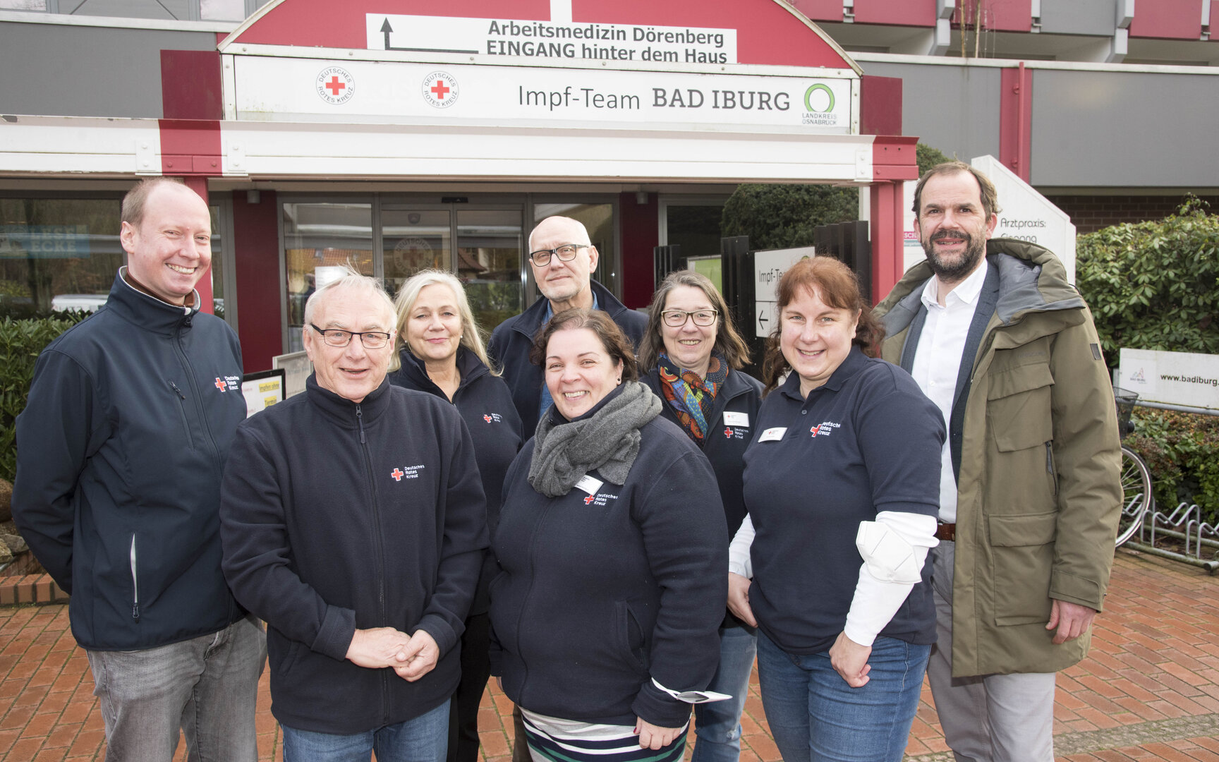 Bildunterschrift: Im Stationären Impfteam in Bad Iburg wird – wie in den anderen Einrichtungen auch – zum Jahresende die Arbeit eingestellt. Während der vergangenen Monate gehörten zum Team des Deutschen Roten Kreuzes (von links) Einsatzleiter Philip Engler, Alois Brinkschröder, Marietta Vollmer, Thomas Walla, Isabella Rodriguez, Dagmar Riehemann und Simone Fieke. Für den Landkreis Osnabrück hatte Volker Trunt (rechts) die Organisation geleitet.