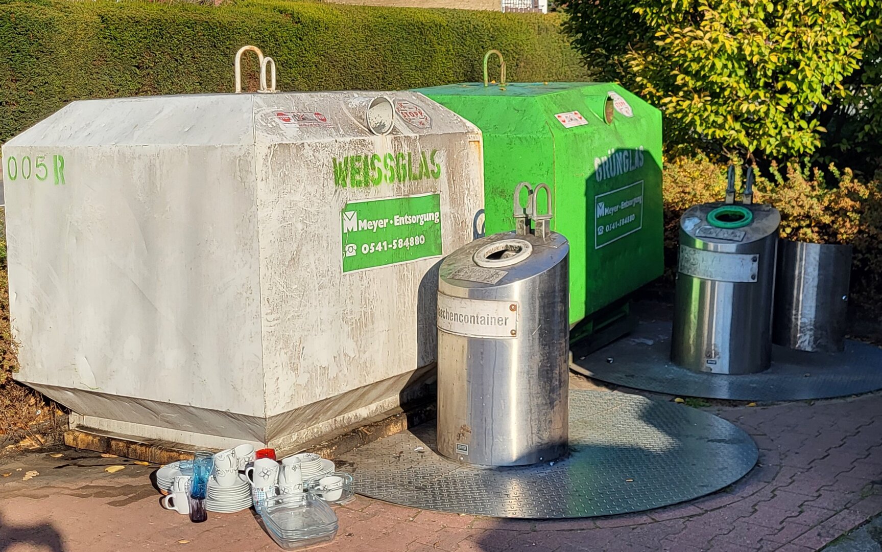 Aufgrund von wiederholt falscher Abfallbeseitigung an den Glas-Containern an der Hüttenstraße 14 – 16 in Hagen a.T.W. (siehe Bild) weist die Gemeinde Hagen a.T.W. aus aktuellem Anlass darauf hin, dass die Glas-Container kein Ablageort für Haushaltsgeschirr sind.