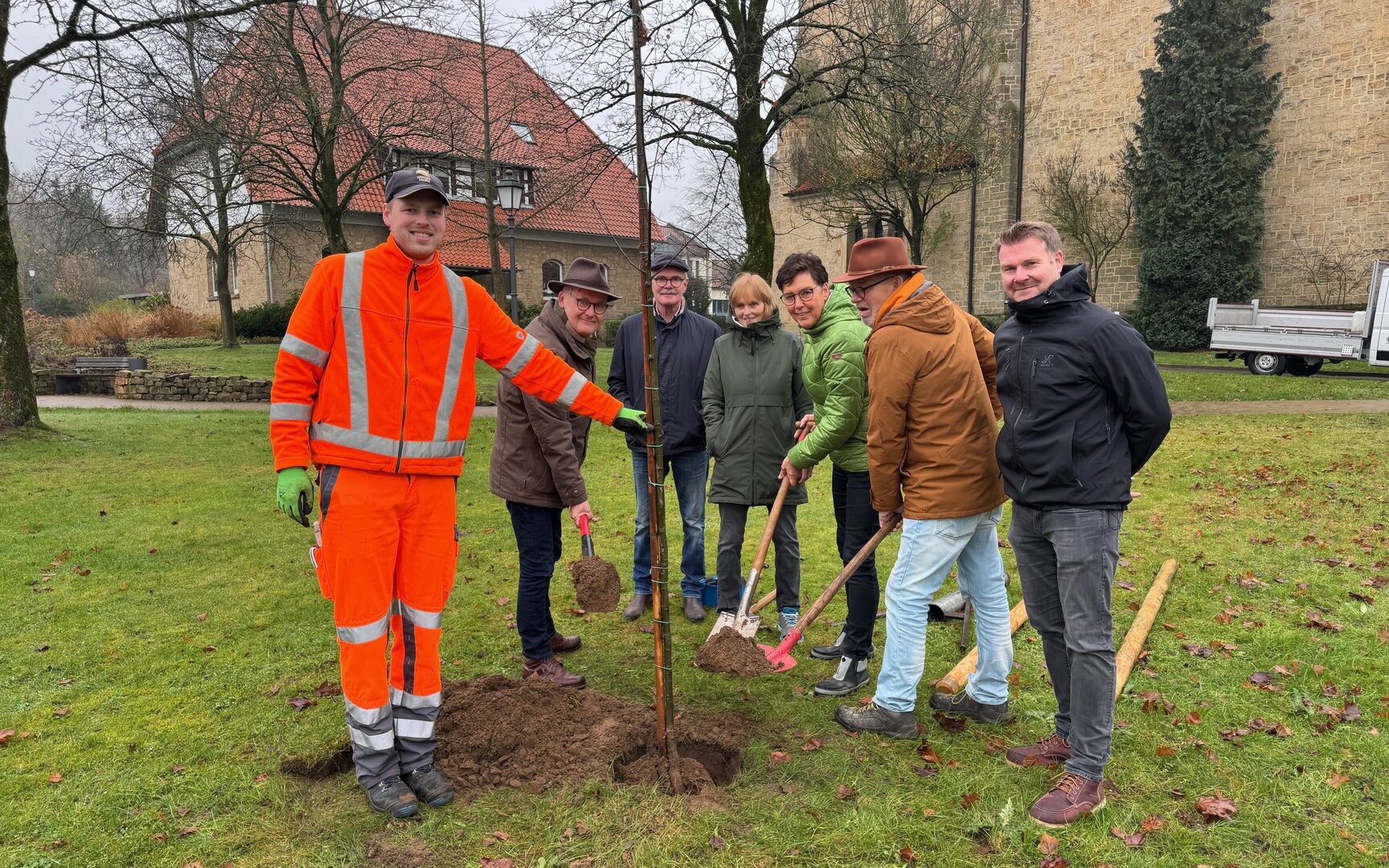 Die Bäume wurden am Freitag, 28. November, in den Mitgliedskommunen gepflanzt. So auch in Hagen a.T.W.(Foto v.l.n.r.): Vorarbeiter Bauhof Fabian Konersmann, Fachdienstleiter Bauleitung, Tiefbau und Umwelt Stefan Altevogt, stellvertretender Bürgermeister Rainer Plogmann, Ilka Pötter als Vertreterin der stiftenden Naturschutzstiftung, Bürgermeisterin Christine Möller, Umweltschutzbeauftragter Ullrich Elixmann und KUNA Ausschussvorsitzender Christoph Dransmann pflanzten die Rote-Eiche oberhalb der Sportgeräte, Zum Jägerberg 17 und in der Kirchstraße 3 in Gellenbeck.