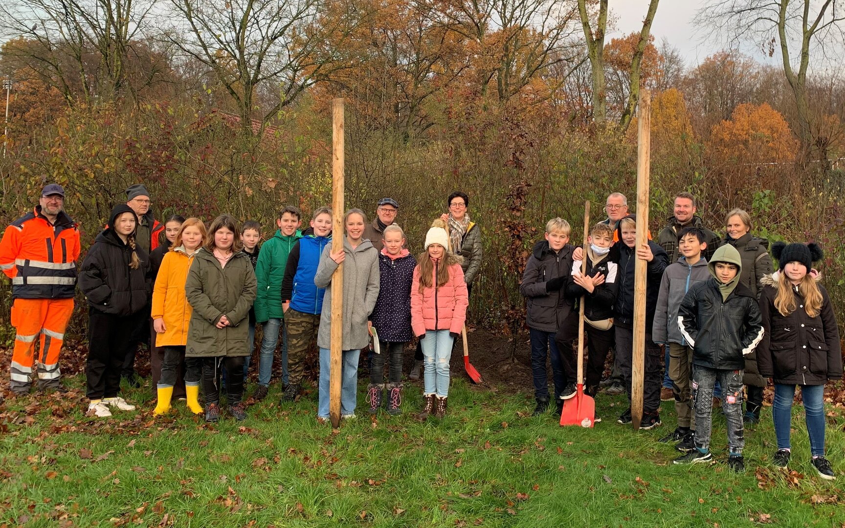 2,50 m ist die Rotbuche, deren Blätter – Widererwarten - grün blühen, hoch. Die Rotbuche, der häufigste Baum Deutschlands, wurde höchstpersönlich von Bürgermeisterin Christine Möller, Fachdienstleiter Stefan Altevogt, Ratsfrau und Mitglied des Kuratoriums der Naturschutzstiftung Ilka Pötter, KUNA Ausschussvorsitzenden Christoph Dransmann, Umweltschutzbeauftragten Ulli Elixmann, Christian Hanus als Baumfachmann des Bauhofes und mit der Unterstützung der 6. Klasse von Andreas Dockmann-Völler (Lehrer und Ratsmitglied) in die Erde gelassen und mit Pflöcken und Seilen befestigt, auf das er schnell anwachsen und gedeihen möge!