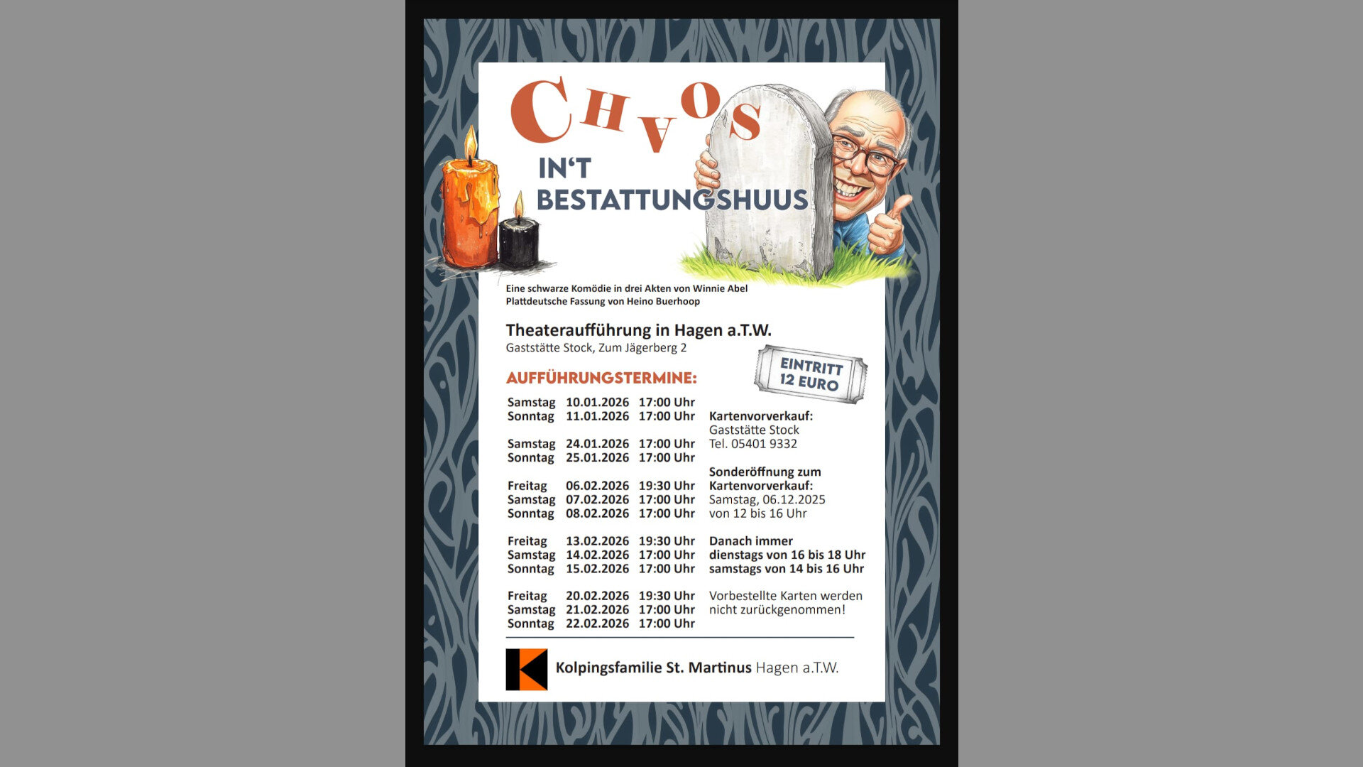 Eintritt: 12 Euro, Kartenverkauf in der Gaststätte Stock, Zum Jägerberg 2, 49170 Hagen a.T.W., Tel. 05401-9332, Kartenverkauf dienstags von 16 bis 18 Uhr und samstags von 14 bis 16 Uhr, vorbestellte Karten werden nicht zurückgenommen.